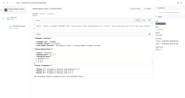 Here's a complete example showcasing a logistics dispatch agent with Agenta instrumentation: